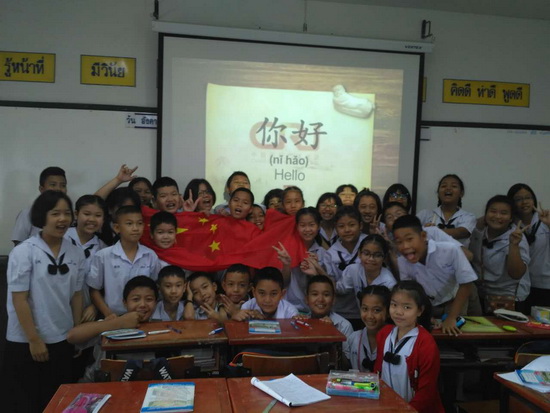 我的第一节汉语课主要是有关中国的介绍和简单的问候,为了让员工能够感兴趣,游戏、实物展示、图片、视频、歌曲轮番上阵,“中国”、“你好”终于在员工的脑中变成具象。最让我感动的是当我拿出中国国旗的时候,每个班的员工都很激动,跑到教室前面想和国旗合影,我想“中国”两个字在他们心里不再只是读出来那么简单了;最见成效的则是当我在校园里见到员工时,不再是初见时泰语的“萨瓦迪卡”,而是字正腔圆的“你好!”或者“再见!”,简单的两个字,多多少少还是给独自一人的我些许慰藉和力量。