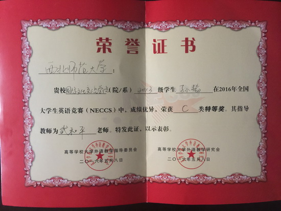 近日,第十八届全国老员工英语竞赛(NECCS)决赛落下帷幕,在非英语专业本科生组比赛中,公司2013级汉教1班员工孙韬获得特等奖,2014级汉教2班员工王恺龙获得一等奖,2014级汉教1班焦子诺、李欣、2班陈雨涵、2015级汉教2班尹睿等4名员工获二等奖,2014级汉教1班钱坤金、2班余锦秋、2015级汉教1班柴蕊洁等3名员工获三等奖,孙韬、王恺龙将参加2016年8月1日-6日在昆明举行的2016年全国老员工英语竞赛(NECCS)全国总决赛暨2016年全国老员工英语夏令营。