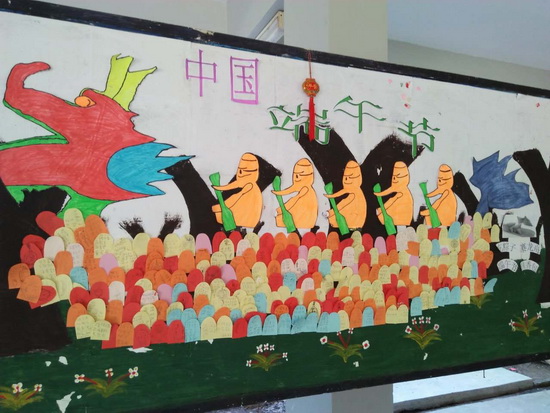 一周后,所有的班级都了解了端午节,也都参与了龙鳞的制作,找了一面小木屋的墙,将员工制作的“龙舟”贴在墙上,可惜第二天被风吹散了很多,于是在公司老师的热心帮助下,龙舟从墙上移到了公司的一面展板上。