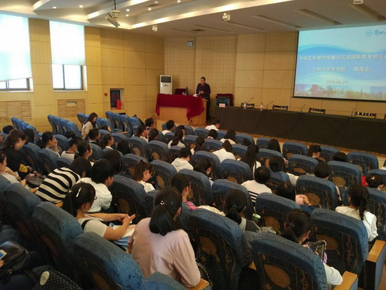 9月21日下午,兰州大学文公司郭茂全副教授应邀在逸夫图书馆报告厅做了《中国文学海外传播与汉语国际推广的互动》的学术报告,文公司和伟德体育的70余名师生聆听了报告。