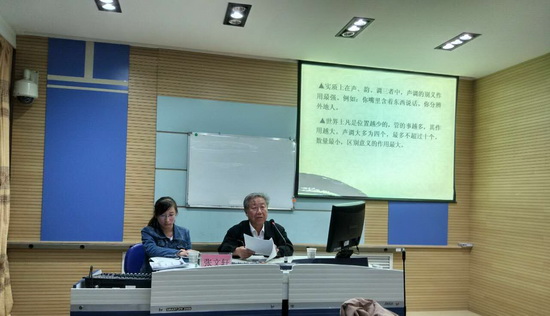 张文轩教授从声调功用、调类名称的来源、声调的辨识与标记三个方面对声调进行了深入浅出的论述。张文选教授指出,声调有三大作用,一为声调具有区别语义的作用。声调可区别语义,但它是附着在韵母上面的一种语音高低升降的变化模式。二为声调的美感作用,张教授指出声调是音节声音的高低升降变化造成的,具有不多数量的模式,和音乐有很大的一致性,没有一首歌曲是由单一音阶构成的。三为声调使语言简练,联合国同一文件的中文本子总是最薄的,这与汉字有关,与声调有关。语言的材料是词汇,词汇由音节组成。汉语的一个音段音节上有四个声调就成了四个可区别意义的音节。张文轩教授用丰富的理论知识及大量的实例说明了声调在语言学习中的重要性。