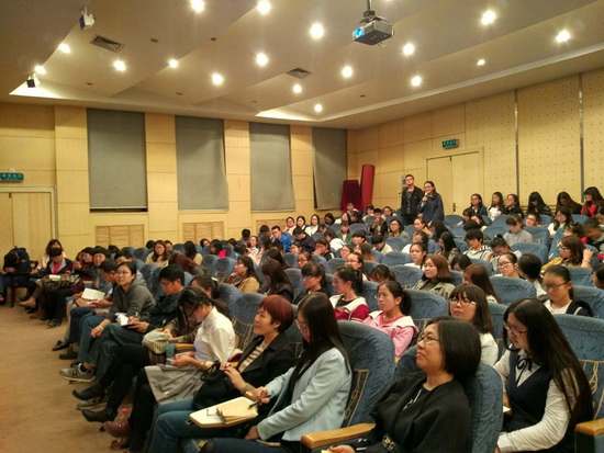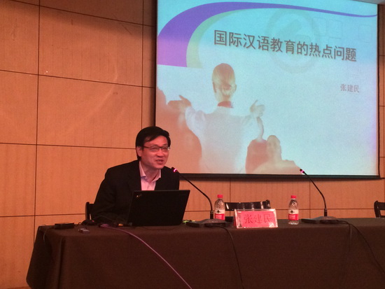 张建民教授从国际汉语教育专业的名称定义、国际汉语教育的理论基础、汉语教学与汉语教育的区别、国际汉语教育的经济价值以及国际汉语教育的瓶颈、宗教和国际汉语教育的关系等几个方面对国际汉语教育中的热点问题作了详细的论述。报告内容观点新颖,深入浅出,风趣幽默,场内气氛十分活跃。参会人员认真聆听了报告并就相关问题与张老师进行了讨论与交流。