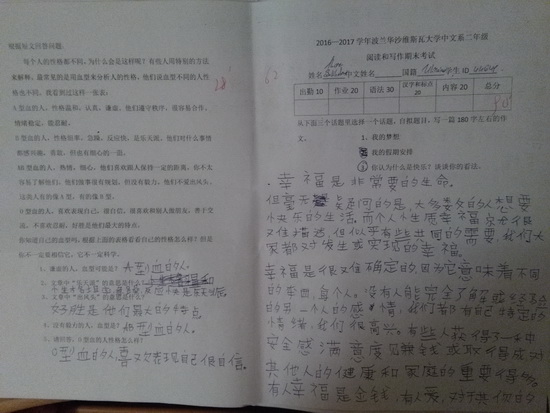 我任教的是波兰华沙维斯瓦大学的孔子课堂,主要负责教授汉语系三年级的语法课、商务汉语课以及阅读写作课,此外,每个周末还承担了面向社会工作人员的教学工作,包括两周一次共3个课时的Reading and Writing课和两周一次共3个课时的Business Chinese课。就个人而言,在这一段时间的汉语教学中,根据公司的教学安排、教学风格、教学对象的特点以及水平进行有效的教学计划和教学安排,这是“高质量”的完成学期任务的有效保证。我也正是这样要求自己的,我在新学期第一节上课时会先提前告知员工这学期的教学安排、教学计划以及考试评分规则,让员工提前对汉语课程的教学安排有一个心理准备和学习计划。汉语专业二年级的Business Chinese课安排在每周二下午,由于没有教材,学科专业性强,而且员工的汉语水平刚刚通过HSK3级,但是,员工对中国商业文化充满了热情和学习的欲望,针对这些特点,在备课时,严格选择教学材料和教学主题,在教学材料上尽量删减语法、控制词汇难度;在教学主题的选择上,尽量选择贴近实际商业生活、现代化的内容。每一次的课堂上,我都精心制作教学PPT,课前提前发PPT到公共教学邮箱,方便员工预习;并打印配套的练习题,方便员工做好课后复习;教学步骤是复习,处理生词,课文的学习和阅读,文化知识的扩充,兴趣的引导以及文化体验(主要是给员工自己学习中国文化创造空间,培养员工主动学习汉语的兴趣。)课下员工可根据自己的兴趣点进行进一步的学习,这一部分主要是通过一些媒介语、视频、文化体验来实现,这期间我们可以用英语和汉语进行讨论对比,增强员工的参与性和融入性,让员工在获得汉语知识的同时也可以体验到汉语文化的魅力。同样是Business Chinese课,但是针对周末班,由于教学对象的不同,我对具体的教学内容、教学进程以及教学重难点方面都做了调整和补充。在进行Reading and Writing课时,我采用让员工选择话题的方式。在学期初期,我根据学期的教学任务和教学时间,选择了12个话题,让员工选择自己感兴趣的8个话题,然后我们确定话题的次序,按照次序进行学习。教学步骤主要是:课上先阅读材料,回答材料上的问题,然后根据所阅读的内容进行讨论并表达自己的看法。最后,我进行总结纠正和布置作业,我根据教学内容布置话题,员工进行写作,写作这一部分根据情况可在课上完成也可作为作业。下次课时和员工一起来分享作业。期末考试的题目就从这8个话题里选择。如图所示,是汉语系三年级员工(通过HSK3级水平)的读写课的期末试卷: