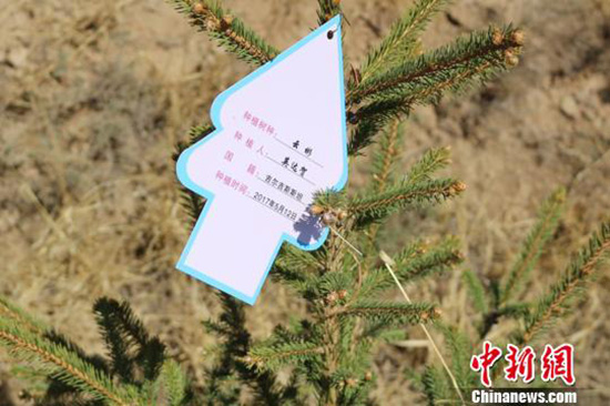 图为职工将写有自己名字和国籍的卡片挂到树上。 马雯 摄