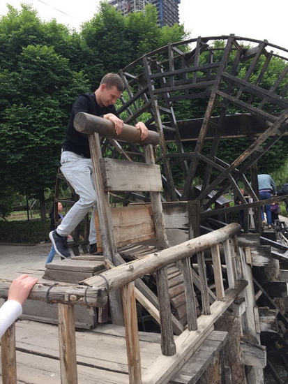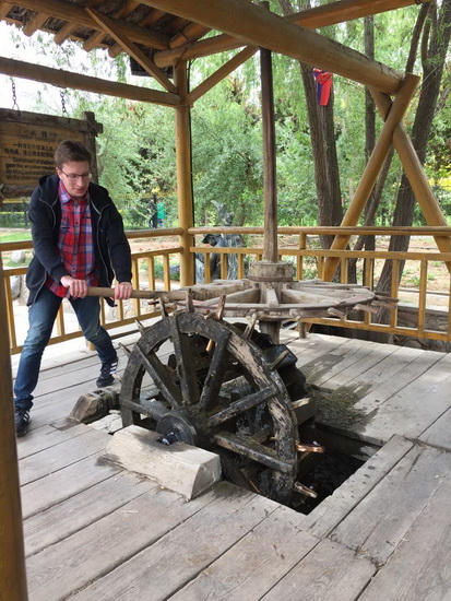 在兰州水车博览园,职工争相体验手推水车、脚踏水车。一边观察不同形式的水车原理,一边了解兰州的农耕文化。