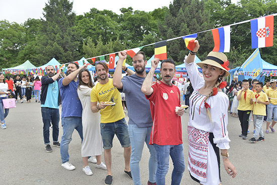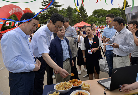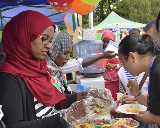 在各国美食区,韩国的泡菜饼、越南的春卷、孟加拉的咖喱饭、苏丹的抓饭最具人气。大家凭手中的“护照”到各国展棚前品尝食物、留取纪念印章。哈萨克斯坦职工精心烧烤的烤肉刚刚出炉就被分发完,身着摩尔多瓦传统白裙的职工与大家分享着从遥远的祖国带来的美酒……