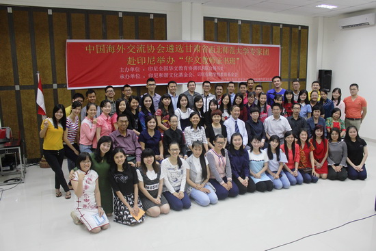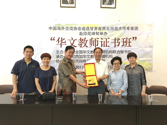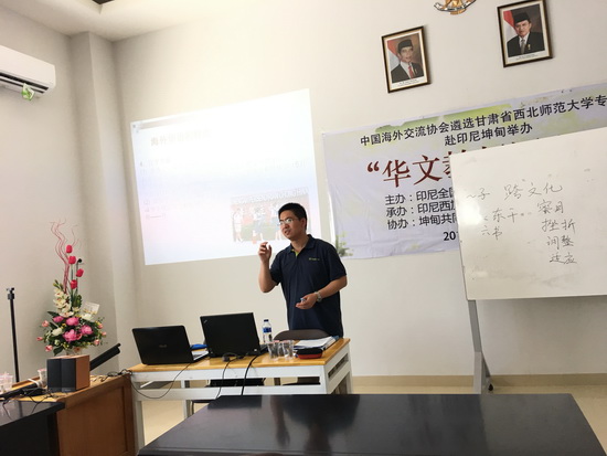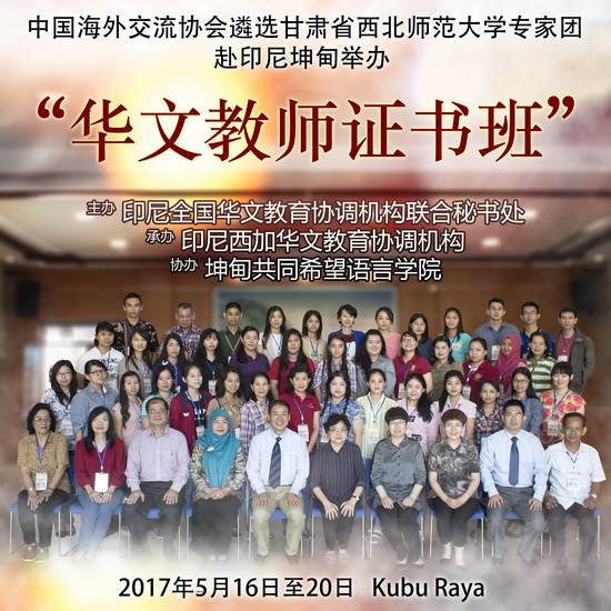 为弘扬中华文化,推动印尼华文教育向标准化、规范化、专业化方向发展,5月14至28日,受中国海外交流协会的委托,甘肃省海外交流协会组织公司刘晓玲、李华、杨福亮等三位教师组成专家团赴印尼坤甸和实拉班让两地开展“华文教师证书”培训工作,当地123名华文教师参加了培训。