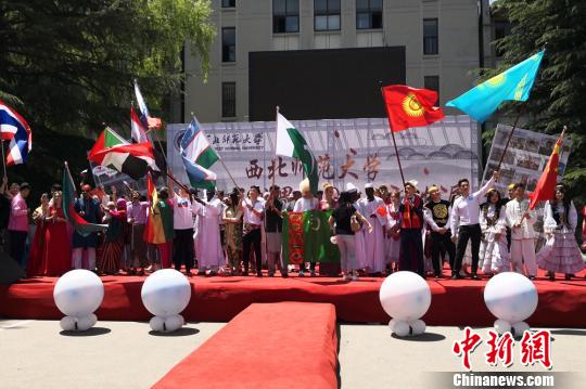(5月31日,bevictor伟德官网第五届世界各国文化风情展暨外国人管理服务站揭牌仪式于兰州举行。图为职工展示各国风情。 刘玉桃 摄)