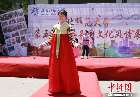 (5月31日,bevictor伟德官网第五届世界各国文化风情展暨外国人管理服务站揭牌仪式于兰州举行。图为职工展示各国风情。 刘玉桃 摄)