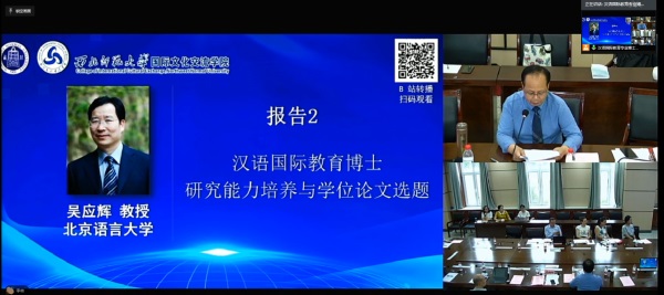 吴应辉教授以“汉语国际教育博士研究能力培养与学位论文选题”为题,指出研究能力需要分类训练,它包括“选题、数据处理和软件工具使用、使用科学研究方法、期刊论文写作、学位论文写作和课题申报和课题研究”等六个方面的能力,并列举了诸如“国际中文教育学科理论体系构建研究”、“主要面向国外中文团队培养研究”等16个前沿选题领域。吴应辉教授指出:我们不仅要着眼于国内汉语教学的问题,而且要放眼世界各国的汉语教育,并从这些方面来确定选题和培养方式。
