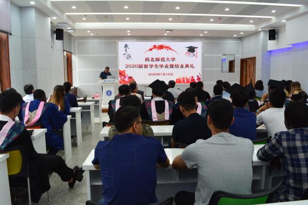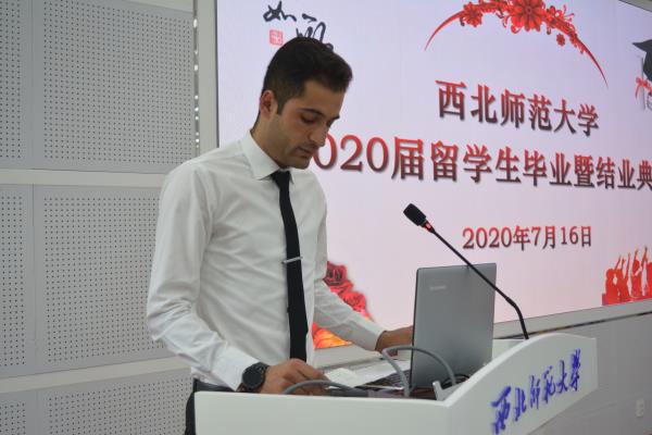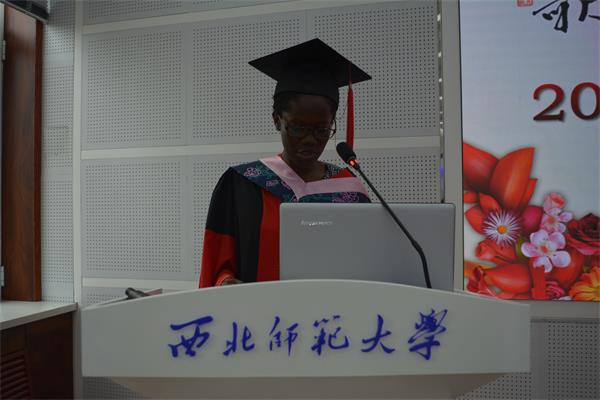 来之加纳的2020届博士研究生格瑞丽代表全体毕业生发言。她表示,四年前来自五湖四海的大家怀着对古老东方的向往来到了中国,来到了西北师大学习,四年来感受到公司和老师对我们的关爱,尽管大家母语不同,但是汉语为我们架起了桥梁,在西北师大的留学时光永远值得铭记。