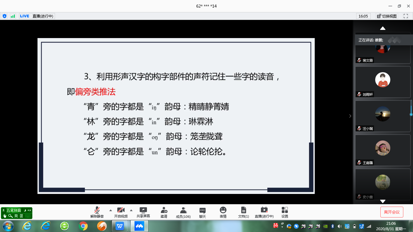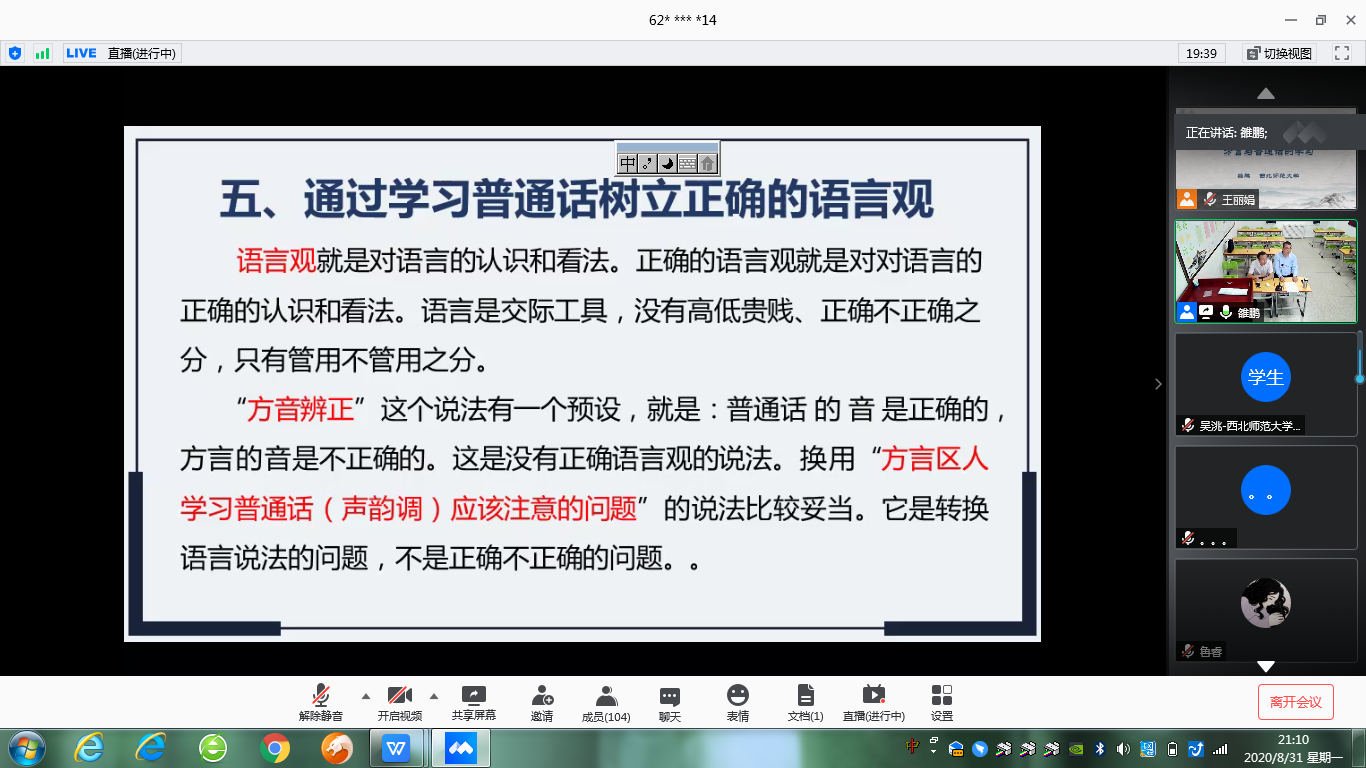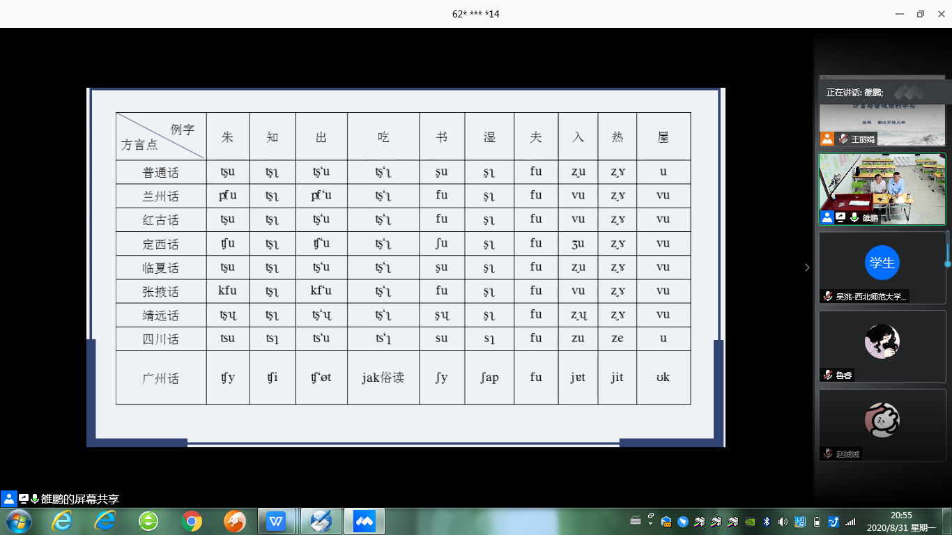 2020年8月31日晚19:30-21:30,公司文公司语言学及应用语言学研究所所长、全国汉语方言学会会员、中国社会语言学学会会员、甘肃省地名研究中心学术委员、甘肃书法家协会会员、甘肃《周易》研究会会员、文公司硕士研究生导师雒鹏副教授莅临公司语言文字推广基地云端大讲堂,以腾讯会议的形式作了题为“方言与普通话的学习”的精彩专题学术讲座。本次讲座是公司甘肃省语言文字推广基地云端大讲堂系列讲座第二场,由伟德体育副经理杨同军教授主持,来自校内外广大师生、语言教育和语言文字工作者参加了本次线上学术活动。