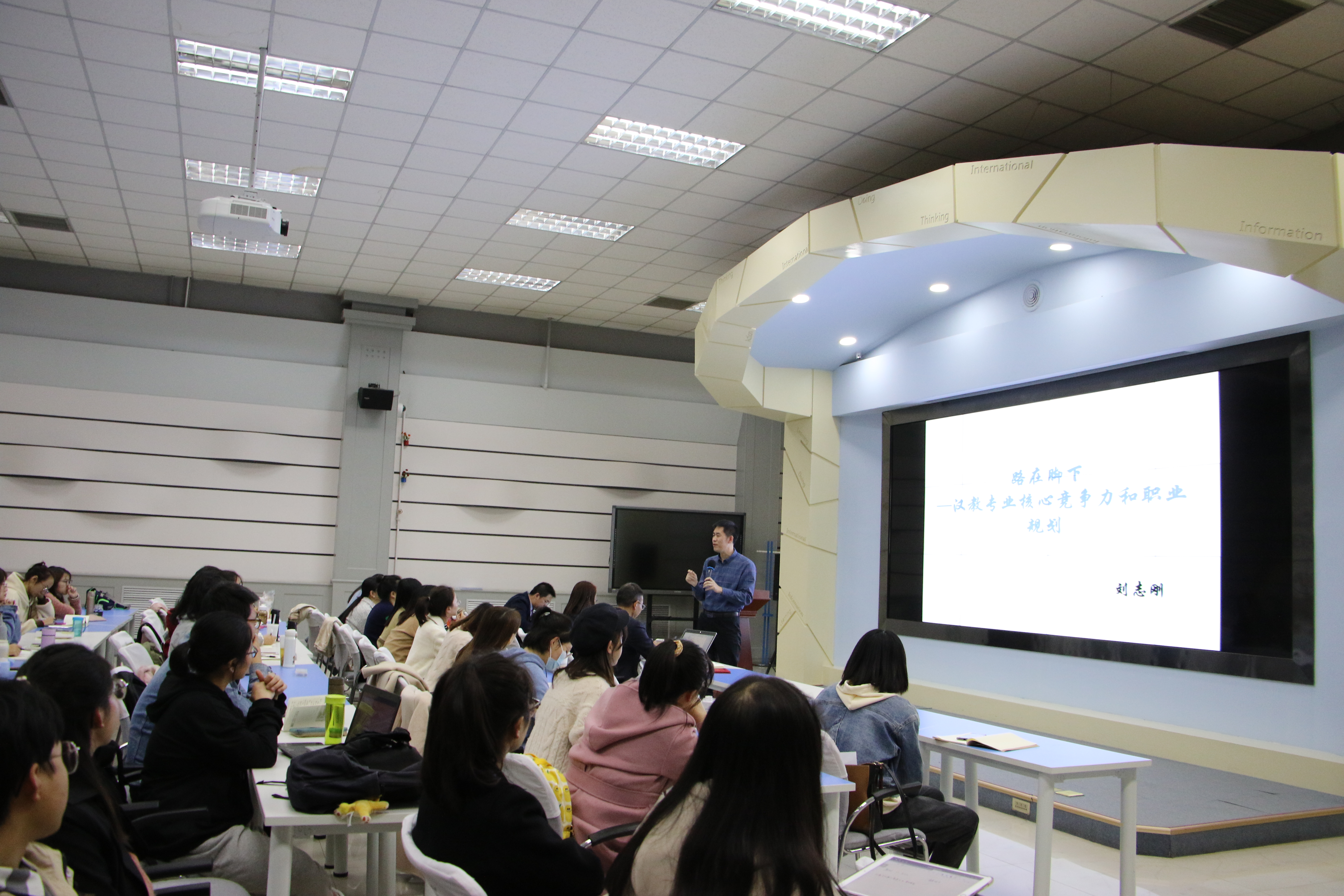 刘志刚已有多年的对外汉语教学经验,对“对外汉语教师”这一职业的各个不同层面都有广泛的了解和深入的思考。他指出,当前汉语国际教育专业的就业形势并不乐观,很多这个专业的在读同学对自身定位和未来职业发展有着困惑和迷茫。通过这场讲座,他希望能以自身的亲身经历和思考帮助同学们对自己的专业定位以及未来发展方向有一个更清晰的认识和规划,走出一条适合自己、属于自己的对外汉语教师之路。讲座结束前,刘老师送给在座师生一句话“人各有命、人各有志、人各有路”,并祝愿大家都能找到自己热爱的事业。