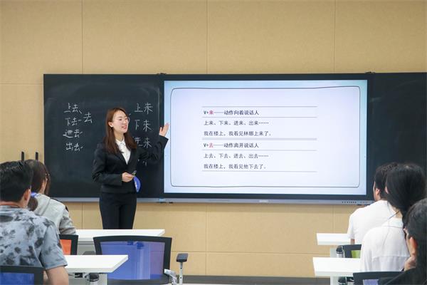 决赛现场,张亦潇讲解《发展汉语I》课文“妈妈给我寄来了礼物”中的语法点:简单趋向短语“来”和“去”,她播放生动有趣的动画视频帮助员工代入情境,并使用玩偶教具演示“来”和“去”表示动作的不同方向。来自巴基斯坦的职工同学积极参与互动,踊跃回答问题,展现了积极活泼的课堂氛围。最终,张亦潇获第二名,并被推荐参加全省总决赛。