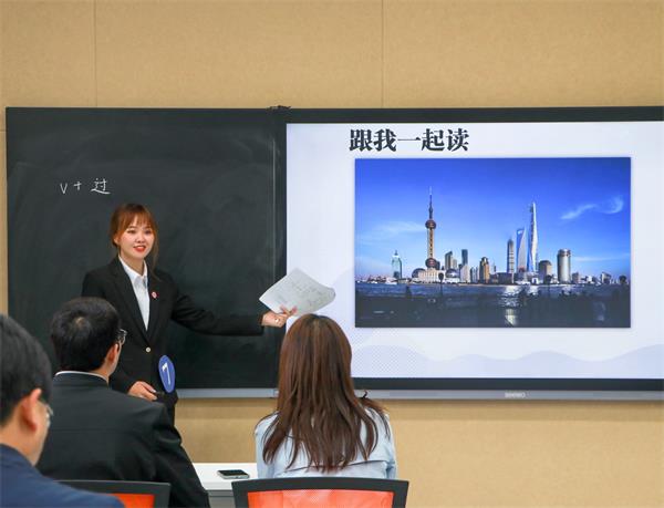 权杰通过说课和试讲两个部分讲解了《发展汉语I》课文“我当过英语老师”中“V+过”的语法点,运用大量的图片和视频带领现场职工思考和互动,达到了精讲多练以员工为中心的教学原则,组织职工进行造句对话练习,职工最终掌握该语法意义及用法,实现了顺利交际的目的。最终,权杰获第七名。