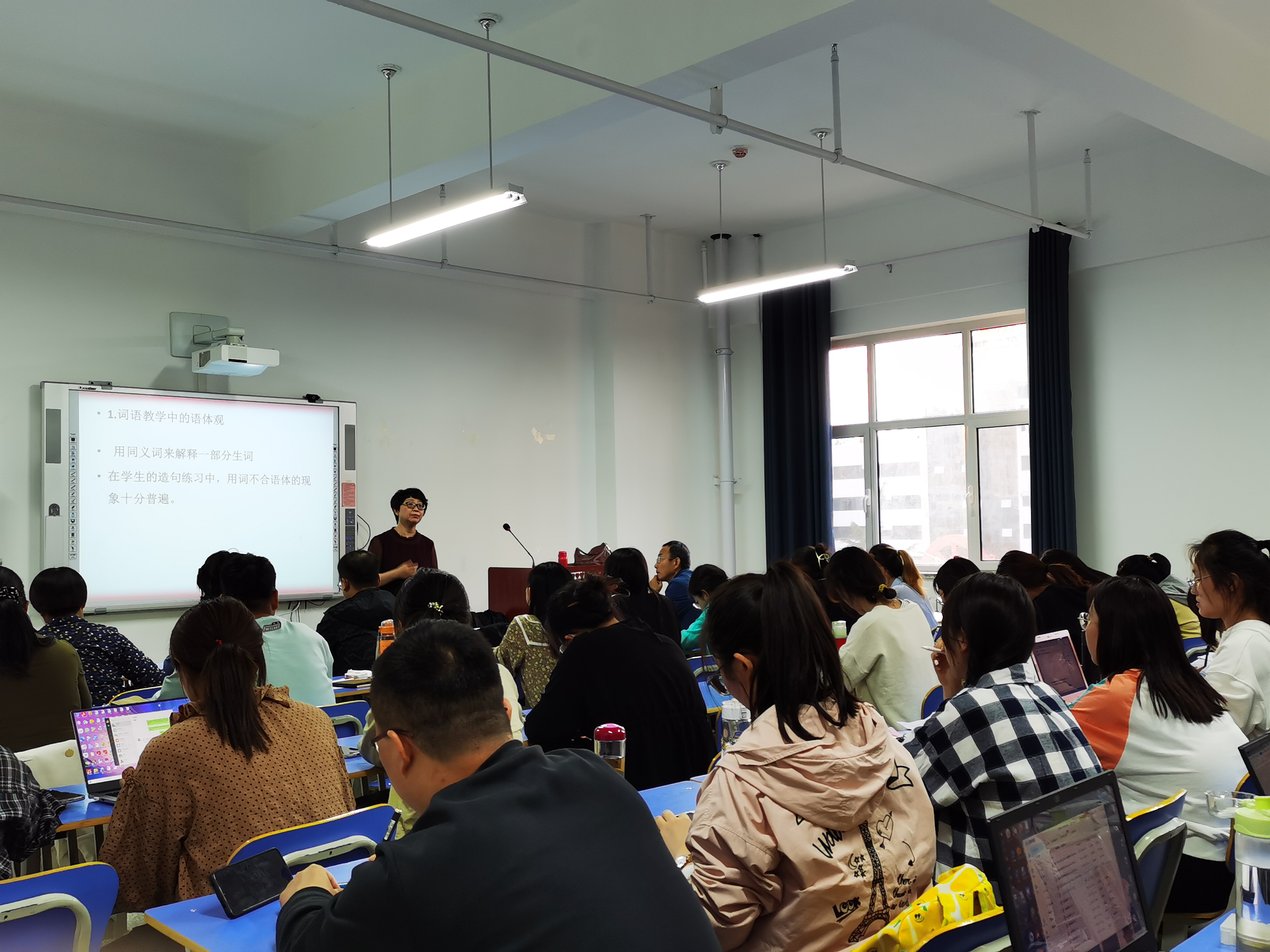 讲座中,周利芳副教授从教师时刻要有语体意识和语境意识开始,讲了语体观和语境观的重要性。通过与职工对话的实际例证“你的手好了?”“痊愈了。”等句子讲解了词汇和句子教学中的语体观,引发同学们思考。