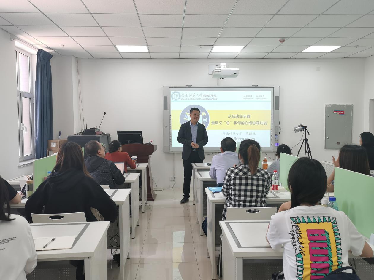 5月24日,应公司邀请,在文科实训楼404教室,贾泽林副教授来院做了题为《“从互动交际看量级义“总”字句的立场协调功能》的学术讲座。讲座由王晶老师主持,公司师生40余人参加。