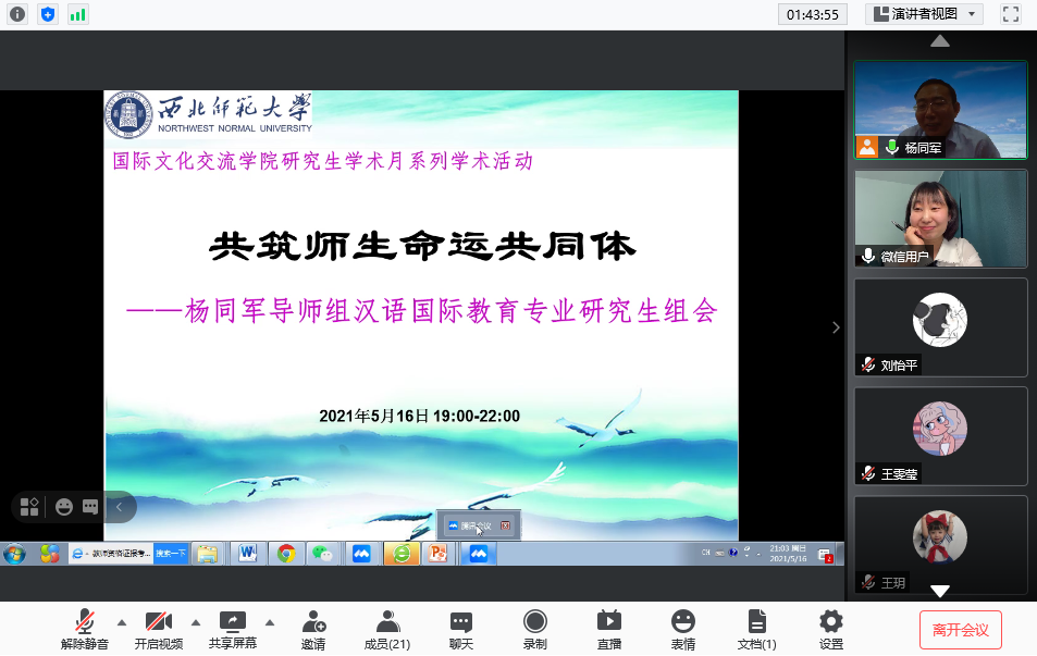 2021年5月16日星期日晚上20:00——22:00,杨同军导师组在腾讯会议召开了全体会议,本次组会的主题为:同成长、互交流,共建师生命运共同体。特邀成员有15届汉硕毕业生陈艺文(现就职于安宁区阳光小学);14届汉硕毕业生李艳婷(现就职于白银税务局)。