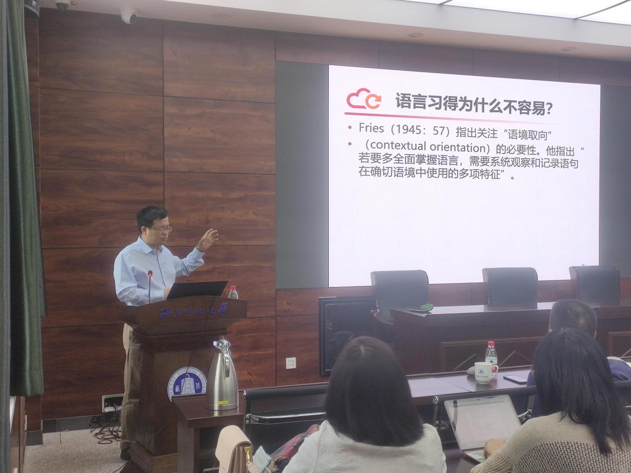 讲座中,许家金教授向在场师生分享了两篇关于基于语料库方面的论文,然后向师生讲解了概率语境共选的四个原则:“真材实用、优选常用、单词连用、情景活用”,提出要为员工提供选材地道、语境典型的优质语言材料。指出真实语用看似杂乱无章,实则是“有序的异质体”。许家金教授还为同学们列举了大量示例,引发同学们思考。