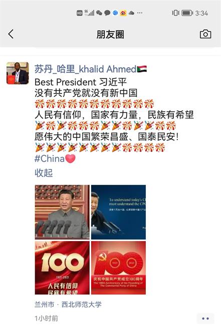 在校来华职工们也自发通过不同方式观看、了解庆祝中国共产党成立100周年大会盛况并纷纷点赞。苏丹籍职工哈里在看完直播盛况后,在微信朋友圈分享了他的喜悦心情,祝福伟大的中国繁荣昌盛、国泰民安。
