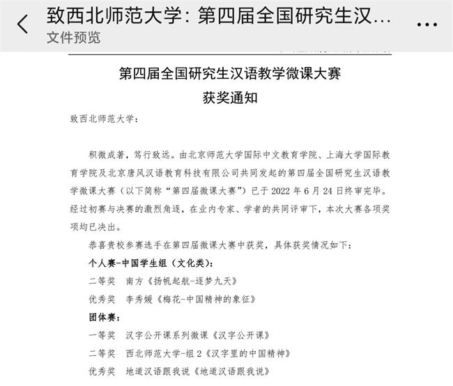 近日,由北京师范大学、上海大学、北京唐风汉语教育科技有限公司承办的第四届全国研究生汉语教学微课大赛落幕,bevictor伟德官网汉语国际教育专业硕士研究生在此次微课大赛中表现出色,成绩喜人,斩获团体赛一等奖、二等奖、优秀奖,个人赛二等奖、优秀奖多项,伟德体育获“优秀组织单位”奖。
