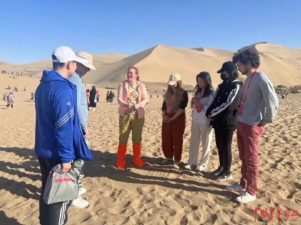 研学团成员在鸣沙山交流