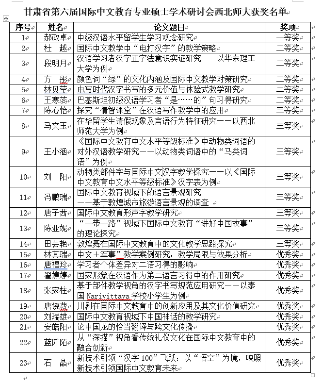在当天下午举行的学术研讨会上,西师学子同样表现出色,国际中文教育专业研究生郝政卓提交的论文荣获一等奖,杜越等五人提交的论文荣获二等奖,陈心怡等八人提交的论文荣获三等奖,林其瑞等九人提交的论文荣获优秀奖。