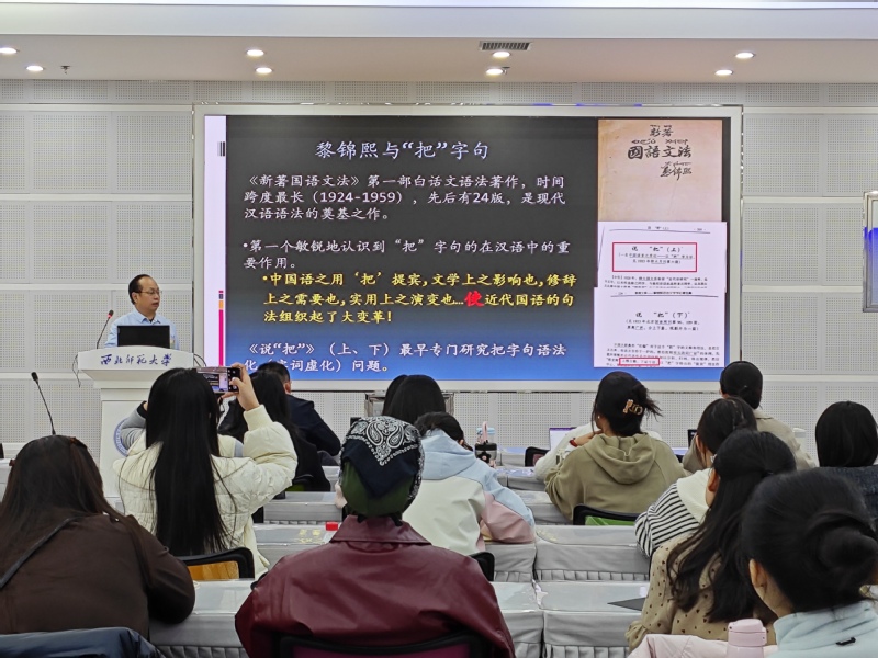 武教授特别强调了黎锦熙先生治学精神的当代意义。他深入阐释了“例不十,法不立”的研究原则,指出这一注重实证、强调归纳的方法论对当今语言学研究仍具重要指导价值。通过古今研究案例的对比,武教授展示了如何将传统语言学方法与现代理论有机融合,推动汉语研究在继承中实现创新。他还分享了黎锦熙先生“知术欲圆,行旨须直”的治学理念,勉励师生在学术探索中既要保持思维的灵活性,又要坚守学术的严谨性。
